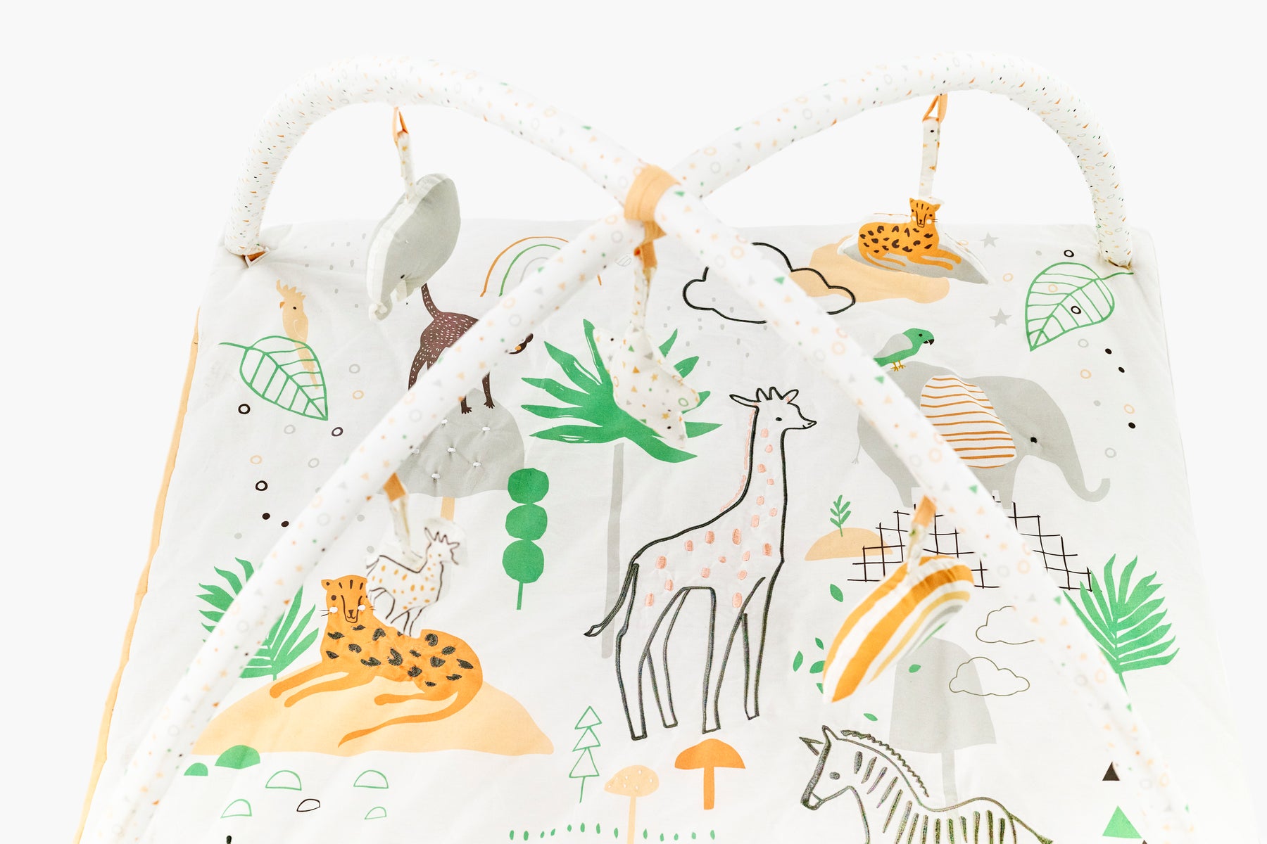 Create a calming environment for your baby's early playtime with the Jolly Jumper SweetScapes Play Gym. Combining plush, soothing fabrics with carefully designed sensory elements, this play gym offers a cushioned mat for comfort and overhead toys to stimulate visual tracking and promote hand-eye coordination. Its sophisticated neutral colours complement your nursery décor, while the smart foldable design ensures easy assembly and convenient storage.
